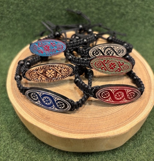 ●アイヌ文様(魔よけの文様)を彫り、 ひもを編みこみで仕上げています。 ひもが絞りタイプなのでサイズを気にせず使用出来ます。 トップのサイズ:長さ35mm・幅9mm ★裏にネーム彫り無料で致します ネーム彫りされるお客様はご注文の際にオプション欄にご記入お願いし アイヌ民族の伝統文様が施されたブレスレット! 小さめのナチュラルなアクセントも、大人っぽいファッションにもマッチします。 そして、このブレスレットはあなたの腕を飾るだけでなく、知らない誰かにも幸せを届けることができます。きっとあなたのお気に入りの一つになることでしょう。 ※水濡れ、汗、摩擦によって色落ちや色移りする場合があります。1点1点手作りされているため、形や色合いに若干の違いがある場合がございます。